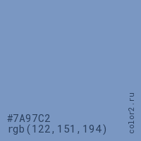 Цвет #7A97C2 в цветовой модели RGB обозначается тремя октетами (122, 151, 194) в десятичном формате и #7A97C2 в шестнадцатиричном (hex) формате, которые являются интенсивностью красного 122 (hex 7A), интенсивность зелёного 151 (hex 97) и интенсивность синего 194 (hex C2).