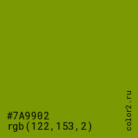 Цвет #7A9902 в цветовой модели RGB обозначается тремя октетами (122, 153, 2) в десятичном формате и #7A9902 в шестнадцатиричном (hex) формате, которые являются интенсивностью красного 122 (hex 7A), интенсивность зелёного 153 (hex 99) и интенсивность синего 2 (hex 02).