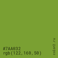 Цвет #7AA032 в цветовой модели RGB обозначается тремя октетами (122, 160, 50) в десятичном формате и #7AA032 в шестнадцатиричном (hex) формате, которые являются интенсивностью красного 122 (hex 7A), интенсивность зелёного 160 (hex A0) и интенсивность синего 50 (hex 32).