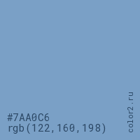 Цвет #7AA0C6 в цветовой модели RGB обозначается тремя октетами (122, 160, 198) в десятичном формате и #7AA0C6 в шестнадцатиричном (hex) формате, которые являются интенсивностью красного 122 (hex 7A), интенсивность зелёного 160 (hex A0) и интенсивность синего 198 (hex C6).