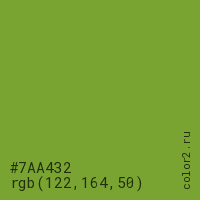 Цвет #7AA432 в цветовой модели RGB обозначается тремя октетами (122, 164, 50) в десятичном формате и #7AA432 в шестнадцатиричном (hex) формате, которые являются интенсивностью красного 122 (hex 7A), интенсивность зелёного 164 (hex A4) и интенсивность синего 50 (hex 32).