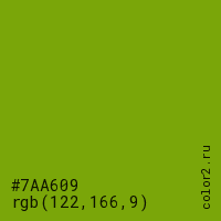 Цвет #7AA609 в цветовой модели RGB обозначается тремя октетами (122, 166, 9) в десятичном формате и #7AA609 в шестнадцатиричном (hex) формате, которые являются интенсивностью красного 122 (hex 7A), интенсивность зелёного 166 (hex A6) и интенсивность синего 9 (hex 09).