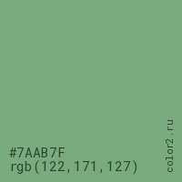Цвет #7AAB7F в цветовой модели RGB обозначается тремя октетами (122, 171, 127) в десятичном формате и #7AAB7F в шестнадцатиричном (hex) формате, которые являются интенсивностью красного 122 (hex 7A), интенсивность зелёного 171 (hex AB) и интенсивность синего 127 (hex 7F).
