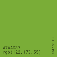 Цвет #7AAD37 в цветовой модели RGB обозначается тремя октетами (122, 173, 55) в десятичном формате и #7AAD37 в шестнадцатиричном (hex) формате, которые являются интенсивностью красного 122 (hex 7A), интенсивность зелёного 173 (hex AD) и интенсивность синего 55 (hex 37).