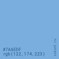 Цвет #7AAEDF в цветовой модели RGB обозначается тремя октетами (122, 174, 223) в десятичном формате и #7AAEDF в шестнадцатиричном (hex) формате, которые являются интенсивностью красного 122 (hex 7A), интенсивность зелёного 174 (hex AE) и интенсивность синего 223 (hex DF).