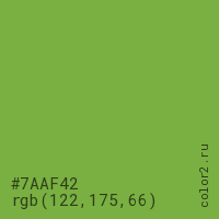 Цвет #7AAF42 в цветовой модели RGB обозначается тремя октетами (122, 175, 66) в десятичном формате и #7AAF42 в шестнадцатиричном (hex) формате, которые являются интенсивностью красного 122 (hex 7A), интенсивность зелёного 175 (hex AF) и интенсивность синего 66 (hex 42).
