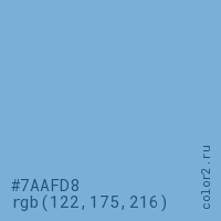 Цвет #7AAFD8 в цветовой модели RGB обозначается тремя октетами (122, 175, 216) в десятичном формате и #7AAFD8 в шестнадцатиричном (hex) формате, которые являются интенсивностью красного 122 (hex 7A), интенсивность зелёного 175 (hex AF) и интенсивность синего 216 (hex D8).
