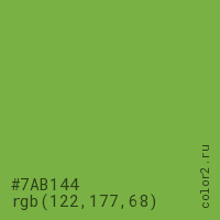 Цвет #7AB144 в цветовой модели RGB обозначается тремя октетами (122, 177, 68) в десятичном формате и #7AB144 в шестнадцатиричном (hex) формате, которые являются интенсивностью красного 122 (hex 7A), интенсивность зелёного 177 (hex B1) и интенсивность синего 68 (hex 44).