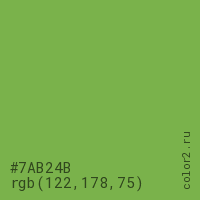 Цвет #7AB24B в цветовой модели RGB обозначается тремя октетами (122, 178, 75) в десятичном формате и #7AB24B в шестнадцатиричном (hex) формате, которые являются интенсивностью красного 122 (hex 7A), интенсивность зелёного 178 (hex B2) и интенсивность синего 75 (hex 4B).