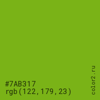 Цвет #7AB317 в цветовой модели RGB обозначается тремя октетами (122, 179, 23) в десятичном формате и #7AB317 в шестнадцатиричном (hex) формате, которые являются интенсивностью красного 122 (hex 7A), интенсивность зелёного 179 (hex B3) и интенсивность синего 23 (hex 17).