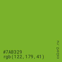Цвет #7AB329 в цветовой модели RGB обозначается тремя октетами (122, 179, 41) в десятичном формате и #7AB329 в шестнадцатиричном (hex) формате, которые являются интенсивностью красного 122 (hex 7A), интенсивность зелёного 179 (hex B3) и интенсивность синего 41 (hex 29).