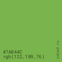Цвет #7AB44C в цветовой модели RGB обозначается тремя октетами (122, 180, 76) в десятичном формате и #7AB44C в шестнадцатиричном (hex) формате, которые являются интенсивностью красного 122 (hex 7A), интенсивность зелёного 180 (hex B4) и интенсивность синего 76 (hex 4C).