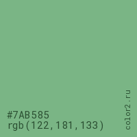Цвет #7AB585 в цветовой модели RGB обозначается тремя октетами (122, 181, 133) в десятичном формате и #7AB585 в шестнадцатиричном (hex) формате, которые являются интенсивностью красного 122 (hex 7A), интенсивность зелёного 181 (hex B5) и интенсивность синего 133 (hex 85).