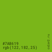 Цвет #7AB619 в цветовой модели RGB обозначается тремя октетами (122, 182, 25) в десятичном формате и #7AB619 в шестнадцатиричном (hex) формате, которые являются интенсивностью красного 122 (hex 7A), интенсивность зелёного 182 (hex B6) и интенсивность синего 25 (hex 19).