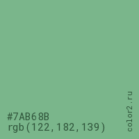 Цвет #7AB68B в цветовой модели RGB обозначается тремя октетами (122, 182, 139) в десятичном формате и #7AB68B в шестнадцатиричном (hex) формате, которые являются интенсивностью красного 122 (hex 7A), интенсивность зелёного 182 (hex B6) и интенсивность синего 139 (hex 8B).