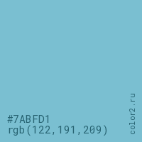 Цвет #7ABFD1 в цветовой модели RGB обозначается тремя октетами (122, 191, 209) в десятичном формате и #7ABFD1 в шестнадцатиричном (hex) формате, которые являются интенсивностью красного 122 (hex 7A), интенсивность зелёного 191 (hex BF) и интенсивность синего 209 (hex D1).