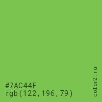 Цвет #7AC44F в цветовой модели RGB обозначается тремя октетами (122, 196, 79) в десятичном формате и #7AC44F в шестнадцатиричном (hex) формате, которые являются интенсивностью красного 122 (hex 7A), интенсивность зелёного 196 (hex C4) и интенсивность синего 79 (hex 4F).