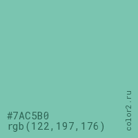 Цвет #7AC5B0 в цветовой модели RGB обозначается тремя октетами (122, 197, 176) в десятичном формате и #7AC5B0 в шестнадцатиричном (hex) формате, которые являются интенсивностью красного 122 (hex 7A), интенсивность зелёного 197 (hex C5) и интенсивность синего 176 (hex B0).