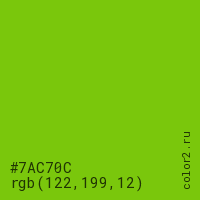 Цвет #7AC70C в цветовой модели RGB обозначается тремя октетами (122, 199, 12) в десятичном формате и #7AC70C в шестнадцатиричном (hex) формате, которые являются интенсивностью красного 122 (hex 7A), интенсивность зелёного 199 (hex C7) и интенсивность синего 12 (hex 0C).