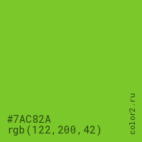 Цвет #7AC82A в цветовой модели RGB обозначается тремя октетами (122, 200, 42) в десятичном формате и #7AC82A в шестнадцатиричном (hex) формате, которые являются интенсивностью красного 122 (hex 7A), интенсивность зелёного 200 (hex C8) и интенсивность синего 42 (hex 2A).