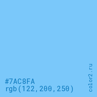 Цвет #7AC8FA в цветовой модели RGB обозначается тремя октетами (122, 200, 250) в десятичном формате и #7AC8FA в шестнадцатиричном (hex) формате, которые являются интенсивностью красного 122 (hex 7A), интенсивность зелёного 200 (hex C8) и интенсивность синего 250 (hex FA).