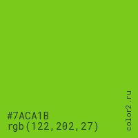 Цвет #7ACA1B в цветовой модели RGB обозначается тремя октетами (122, 202, 27) в десятичном формате и #7ACA1B в шестнадцатиричном (hex) формате, которые являются интенсивностью красного 122 (hex 7A), интенсивность зелёного 202 (hex CA) и интенсивность синего 27 (hex 1B).