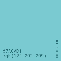 Цвет #7ACAD1 в цветовой модели RGB обозначается тремя октетами (122, 202, 209) в десятичном формате и #7ACAD1 в шестнадцатиричном (hex) формате, которые являются интенсивностью красного 122 (hex 7A), интенсивность зелёного 202 (hex CA) и интенсивность синего 209 (hex D1).