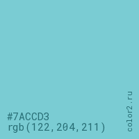 Цвет #7ACCD3 в цветовой модели RGB обозначается тремя октетами (122, 204, 211) в десятичном формате и #7ACCD3 в шестнадцатиричном (hex) формате, которые являются интенсивностью красного 122 (hex 7A), интенсивность зелёного 204 (hex CC) и интенсивность синего 211 (hex D3).