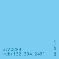 Цвет #7ACCF0 в цветовой модели RGB обозначается тремя октетами (122, 204, 240) в десятичном формате и #7ACCF0 в шестнадцатиричном (hex) формате, которые являются интенсивностью красного 122 (hex 7A), интенсивность зелёного 204 (hex CC) и интенсивность синего 240 (hex F0).