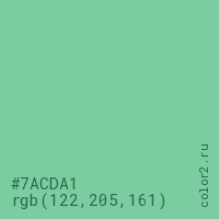 Цвет #7ACDA1 в цветовой модели RGB обозначается тремя октетами (122, 205, 161) в десятичном формате и #7ACDA1 в шестнадцатиричном (hex) формате, которые являются интенсивностью красного 122 (hex 7A), интенсивность зелёного 205 (hex CD) и интенсивность синего 161 (hex A1).