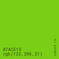 Цвет #7ACE15 в цветовой модели RGB обозначается тремя октетами (122, 206, 21) в десятичном формате и #7ACE15 в шестнадцатиричном (hex) формате, которые являются интенсивностью красного 122 (hex 7A), интенсивность зелёного 206 (hex CE) и интенсивность синего 21 (hex 15).