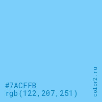 Цвет #7ACFFB в цветовой модели RGB обозначается тремя октетами (122, 207, 251) в десятичном формате и #7ACFFB в шестнадцатиричном (hex) формате, которые являются интенсивностью красного 122 (hex 7A), интенсивность зелёного 207 (hex CF) и интенсивность синего 251 (hex FB).