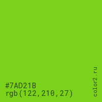 Цвет #7AD21B в цветовой модели RGB обозначается тремя октетами (122, 210, 27) в десятичном формате и #7AD21B в шестнадцатиричном (hex) формате, которые являются интенсивностью красного 122 (hex 7A), интенсивность зелёного 210 (hex D2) и интенсивность синего 27 (hex 1B).