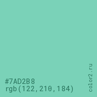 Цвет #7AD2B8 в цветовой модели RGB обозначается тремя октетами (122, 210, 184) в десятичном формате и #7AD2B8 в шестнадцатиричном (hex) формате, которые являются интенсивностью красного 122 (hex 7A), интенсивность зелёного 210 (hex D2) и интенсивность синего 184 (hex B8).