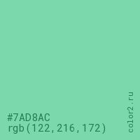 Цвет #7AD8AC в цветовой модели RGB обозначается тремя октетами (122, 216, 172) в десятичном формате и #7AD8AC в шестнадцатиричном (hex) формате, которые являются интенсивностью красного 122 (hex 7A), интенсивность зелёного 216 (hex D8) и интенсивность синего 172 (hex AC).