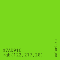Цвет #7AD91C в цветовой модели RGB обозначается тремя октетами (122, 217, 28) в десятичном формате и #7AD91C в шестнадцатиричном (hex) формате, которые являются интенсивностью красного 122 (hex 7A), интенсивность зелёного 217 (hex D9) и интенсивность синего 28 (hex 1C).