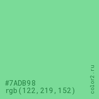 Цвет #7ADB98 в цветовой модели RGB обозначается тремя октетами (122, 219, 152) в десятичном формате и #7ADB98 в шестнадцатиричном (hex) формате, которые являются интенсивностью красного 122 (hex 7A), интенсивность зелёного 219 (hex DB) и интенсивность синего 152 (hex 98).