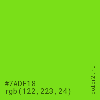 Цвет #7ADF18 в цветовой модели RGB обозначается тремя октетами (122, 223, 24) в десятичном формате и #7ADF18 в шестнадцатиричном (hex) формате, которые являются интенсивностью красного 122 (hex 7A), интенсивность зелёного 223 (hex DF) и интенсивность синего 24 (hex 18).