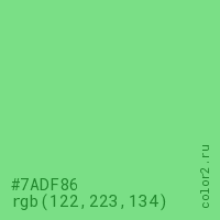 Цвет #7ADF86 в цветовой модели RGB обозначается тремя октетами (122, 223, 134) в десятичном формате и #7ADF86 в шестнадцатиричном (hex) формате, которые являются интенсивностью красного 122 (hex 7A), интенсивность зелёного 223 (hex DF) и интенсивность синего 134 (hex 86).