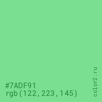 Цвет #7ADF91 в цветовой модели RGB обозначается тремя октетами (122, 223, 145) в десятичном формате и #7ADF91 в шестнадцатиричном (hex) формате, которые являются интенсивностью красного 122 (hex 7A), интенсивность зелёного 223 (hex DF) и интенсивность синего 145 (hex 91).
