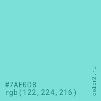 Цвет #7AE0D8 в цветовой модели RGB обозначается тремя октетами (122, 224, 216) в десятичном формате и #7AE0D8 в шестнадцатиричном (hex) формате, которые являются интенсивностью красного 122 (hex 7A), интенсивность зелёного 224 (hex E0) и интенсивность синего 216 (hex D8).