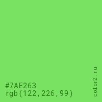 Цвет #7AE263 в цветовой модели RGB обозначается тремя октетами (122, 226, 99) в десятичном формате и #7AE263 в шестнадцатиричном (hex) формате, которые являются интенсивностью красного 122 (hex 7A), интенсивность зелёного 226 (hex E2) и интенсивность синего 99 (hex 63).