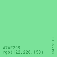 Цвет #7AE299 в цветовой модели RGB обозначается тремя октетами (122, 226, 153) в десятичном формате и #7AE299 в шестнадцатиричном (hex) формате, которые являются интенсивностью красного 122 (hex 7A), интенсивность зелёного 226 (hex E2) и интенсивность синего 153 (hex 99).