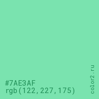 Цвет #7AE3AF в цветовой модели RGB обозначается тремя октетами (122, 227, 175) в десятичном формате и #7AE3AF в шестнадцатиричном (hex) формате, которые являются интенсивностью красного 122 (hex 7A), интенсивность зелёного 227 (hex E3) и интенсивность синего 175 (hex AF).