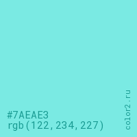Цвет #7AEAE3 в цветовой модели RGB обозначается тремя октетами (122, 234, 227) в десятичном формате и #7AEAE3 в шестнадцатиричном (hex) формате, которые являются интенсивностью красного 122 (hex 7A), интенсивность зелёного 234 (hex EA) и интенсивность синего 227 (hex E3).