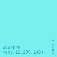 Цвет #7AEFF0 в цветовой модели RGB обозначается тремя октетами (122, 239, 240) в десятичном формате и #7AEFF0 в шестнадцатиричном (hex) формате, которые являются интенсивностью красного 122 (hex 7A), интенсивность зелёного 239 (hex EF) и интенсивность синего 240 (hex F0).
