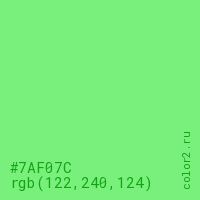 Цвет #7AF07C в цветовой модели RGB обозначается тремя октетами (122, 240, 124) в десятичном формате и #7AF07C в шестнадцатиричном (hex) формате, которые являются интенсивностью красного 122 (hex 7A), интенсивность зелёного 240 (hex F0) и интенсивность синего 124 (hex 7C).