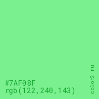 Цвет #7AF08F в цветовой модели RGB обозначается тремя октетами (122, 240, 143) в десятичном формате и #7AF08F в шестнадцатиричном (hex) формате, которые являются интенсивностью красного 122 (hex 7A), интенсивность зелёного 240 (hex F0) и интенсивность синего 143 (hex 8F).
