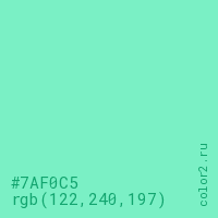 Цвет #7AF0C5 в цветовой модели RGB обозначается тремя октетами (122, 240, 197) в десятичном формате и #7AF0C5 в шестнадцатиричном (hex) формате, которые являются интенсивностью красного 122 (hex 7A), интенсивность зелёного 240 (hex F0) и интенсивность синего 197 (hex C5).