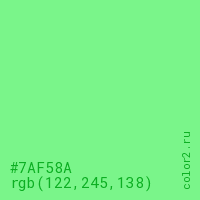 Цвет #7AF58A в цветовой модели RGB обозначается тремя октетами (122, 245, 138) в десятичном формате и #7AF58A в шестнадцатиричном (hex) формате, которые являются интенсивностью красного 122 (hex 7A), интенсивность зелёного 245 (hex F5) и интенсивность синего 138 (hex 8A).